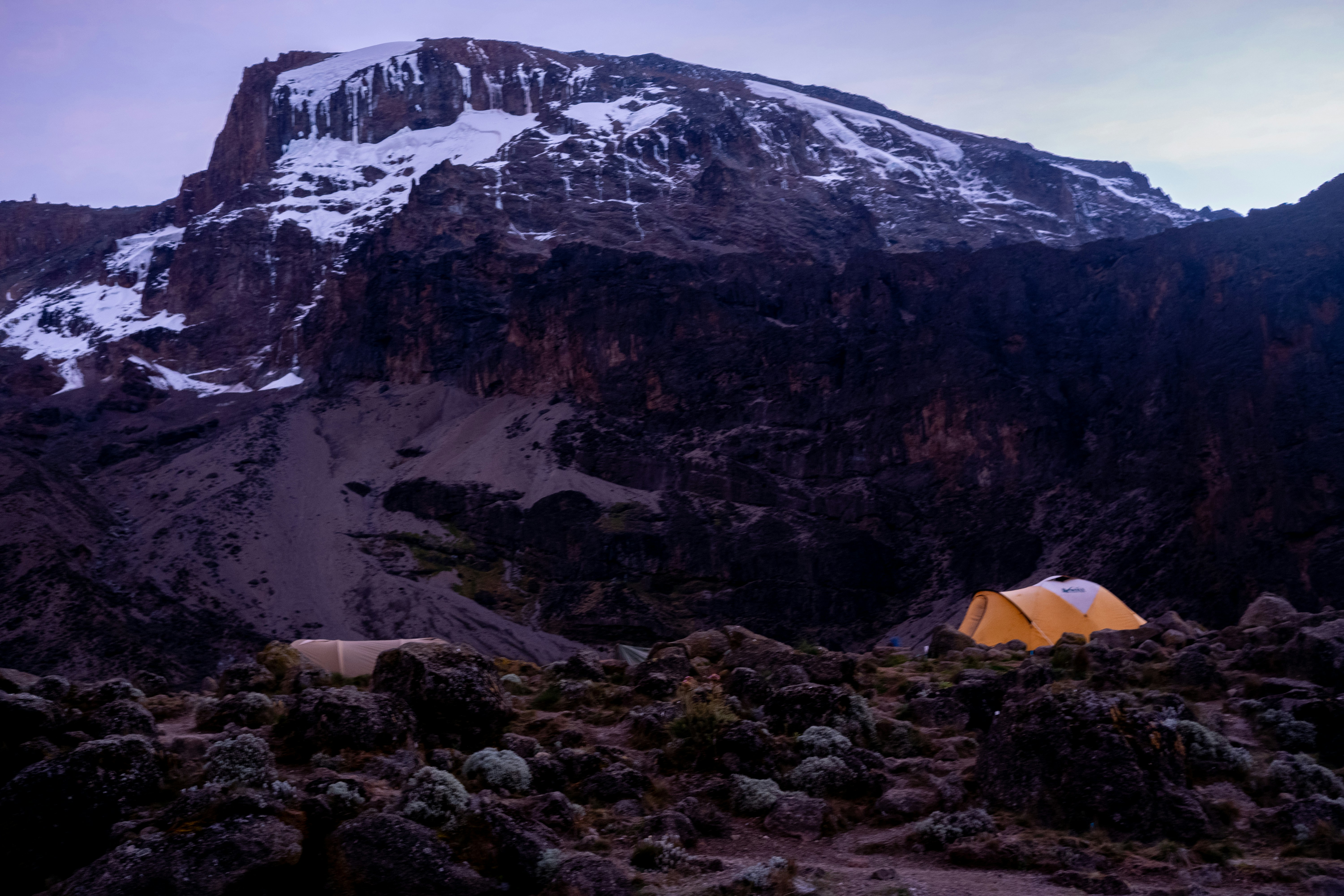 We begin the day by descending into a ravine to the base of the Great Barranco Wall. Then we climb the non-technical but steep, nearly 900 ft cliff. From the top of the Barranco Wall we cross a series of hills and valleys until we descend sharply into Karanga Valley. One more steep climb up leads us to Karanga Camp. This is a shorter day meant for acclimatization.